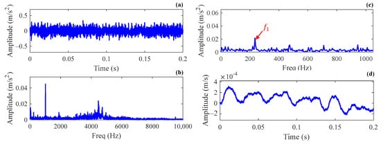 After calculating the root-mean-square (RMS) of all signals in Case 1, the data was divided into healthy stage, early failure stage, intermediate failure stage, and last failure stage according to the variation trend of RMS values as shown in Figure 7a. The upper, middle, and lower signal segments in Figure 7b are vibration signals collected in the early, intermediate, and last failure stages, respectively. It can be seen that signals in the intermediate and last failure stages exhibit strong periodic transients, and the impulses generated in the last failure stage have higher amplitudes, while in the early failure stage, impulses are covered by noise, which makes it difficult to identify the fault feature. Therefore, signals in the early failure stage are selected for bearing fault diagnosis to validate the signal reconstruction capability of the SSR method under heavy background noise. A signal segment with a length of 0.2 s is intercepted from the data collected at the 100th h, and its time domain waveform, frequency spectrum, and envelope spectrum are shown in Figure 8a–c. For reference, the synchronous vibration velocity signal is calculated based on the intercepted acceleration signal and is displayed in Figure 8d, where the RMS value of the vibration velocity is m/s.