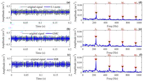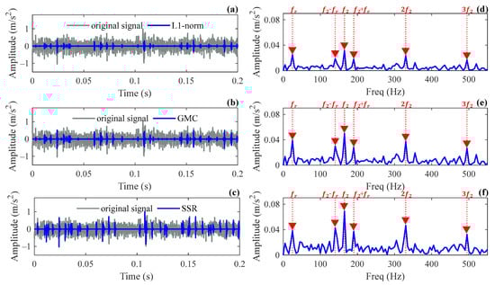 Reconstructed results and their envelope spectrums for different methods in Case 1: (a,d) L1 norm method; (b,e) GMC method; (c,f) SSR method.
