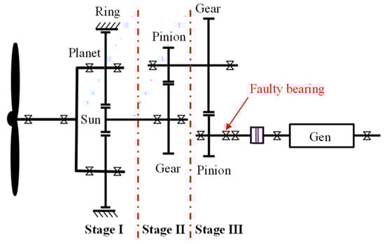 This case is the measured vibration data of a wind turbine gearbox in a wind farm. The drivetrain configuration is shown in Figure 10. The rotor speed is augmented by a planetary gear stage and two parallel stages before feeding into the generator. The gearbox has a total gear ratio of 1:78.3. Through inspection, it was found that there was flaking on the inner raceway of the high-speed shaft bearing. The model of the faulty bearing is QJ328N2MA, and its geometry parameters are shown in Table 3. The raw data sampling frequency is 12.8 kHz, and a signal segment with a length of 0.2 s is intercepted for analysis. At the time of data acquisition, the rotating speed of the high-speed shaft is about Hz. Accordingly, the theoretical fault characteristic frequency of the inner race is calculated as Hz. Figure 11a shows the time history of the intercepted vibration signal. The frequency spectrum and envelope spectrum are depicted in Figure 11b and Figure 11c, respectively. The synchronous vibration velocity signal, calculated based on the intercepted acceleration signal, is displayed in Figure 11d. The RMS value of the vibration velocity is m/s.
