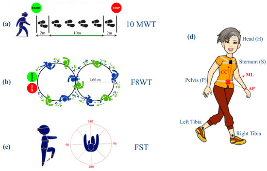 Instrumental assessment performed during dynamic tasks. (a) Schematic representation of the 10 MWT: patients were asked to walk at their preferred speed on a 14 m trail; (b) F8WT: clockwise and counterclockwise directions are indicated with blue and green arrows, respectively; (c) FST: patients were asked to walk on the spot with eyes closed and arms in front of them. (d) Location of the inertial measurement units attached to the participants’ body segments. The axes orientation of the pelvis (P), sternum (S), and head (H) IMUs were the same during the static phase at the beginning of each trial. For the sake of clarity, only the orientation of the pelvis unit is depicted (AP, antero–posterior; ML, medio–lateral; and CC, cranio–caudal).