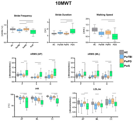 Between–groups analysis of IMU–based assessment during the 10 MWT. Walking speed, stride duration, stride frequency, normalized root mean square (nRMS), improved harmonic ratio (iHR), and log dimensionless jerk on angular velocity (LDLJw) for all groups during 10 MWT. Medians and interquartile ranges are reported. AP, antero–posterior; ML, medio–lateral; CC, cranio–caudal; P, pelvis; S, sternum; and H, head. The horizontal lines indicate statistically significant between–group differences (p < 0.017). Existing significant differences between the control group and each pathological group were not explicitly reported in the figure for the sake of readability.