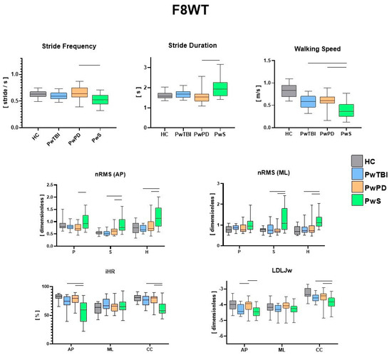 Between–groups analysis of IMU–based assessment during the F8WT. Walking speed, stride duration, stride frequency, normalized root mean square (nRMS), improved harmonic ratio (iHR), and log dimensionless jerk on angular velocity (LDLJw) for all groups during F8WT. Medians and interquartile ranges are reported. AP, antero–posterior; ML, medio–lateral; CC, cranio–caudal; P, pelvis; S, sternum; and H, head. The horizontal lines indicate statistically significant between–group differences (p < 0.017). Existing significant differences between the control group and each pathological group were not explicitly reported in the figure for the sake of readability.