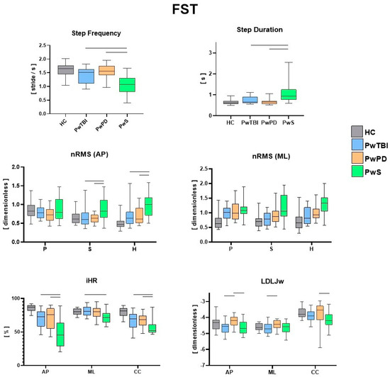 Between–groups analysis of IMU–based assessment during the FST. Step duration, step frequency, normalized root mean square (nRMS), improved harmonic ratio (iHR), and log dimensionless jerk on angular velocity (LDLJw) for all groups during FST. Medians and interquartile ranges are reported. AP, antero–posterior; ML, medio–lateral; CC, cranio–caudal; P, pelvis; S, sternum; and H, head. The horizontal lines indicate statistically significant between–group differences (p < 0.017). Existing significant differences between the control group and each pathological group were not explicitly reported in the figure for the sake of readability.