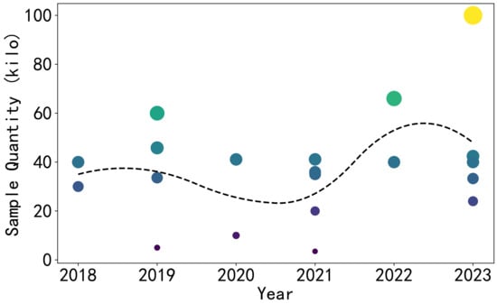 This is the change in sample size used in 21 randomly selected papers on DL-ET in recent years [,,,,,,,,,,,,,,,,,,,,]. In Figure 1, the size of each point represents the size of the sample set used in an article, while different colors are assigned to them for easy distinction. From Figure 1, the number of samples varies from a few thousand to one hundred thousand. Li et al. generated a dataset, a relatively large sample set containing 100,000 data samples through numerical simulation. Each sample includes a normalized capacitance vector and a particle concentration distribution image [].