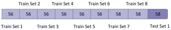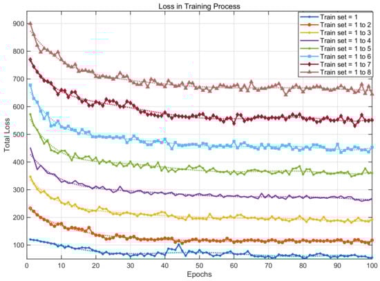 Then, train set 1 (sample numbers: 58), train set 1 to 2 (sample numbers: 112), ..., train set 1 to 8 (sample numbers: 448) are sequentially utilized as training sets for the network. From Figure 4, it can be seen that as the epochs increase, the cross-entropy loss gradually decreases and converges. A total of 100 epochs is a relatively reasonable setting. Because the ideal value of the total cross-entry is not zero and will increase with the increase in the train set, the overall curve gradually moves upward.
