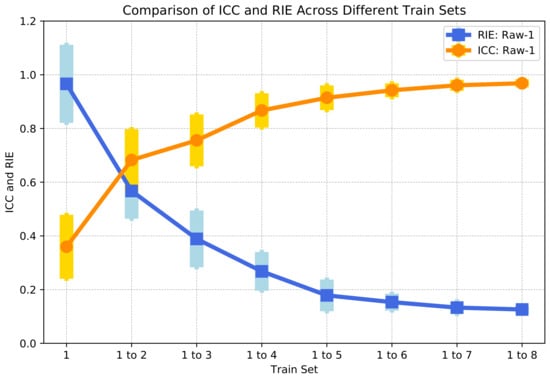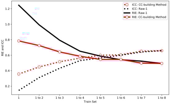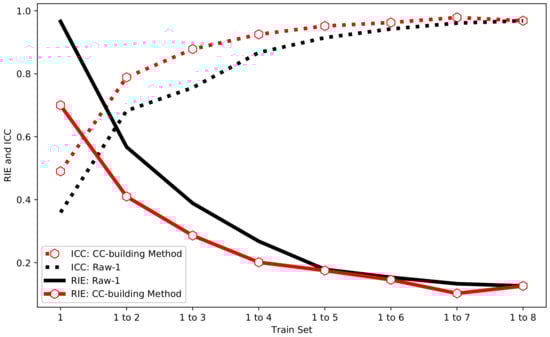 All samples are positioned manually, resulting in a total of 512 experimental samples being obtained. Similar to the simulation, samples with the same serial number were divided into training and testing sets. Since the conditions of simulation are relatively ideal, the experiment serves as a validation. After the experimental sample set is obtained, the process is the same as the simulation sample set, which does not need to be reiterated here. The ICC and RIE of Raw-1 and the CC-building method are shown in Figure 12.