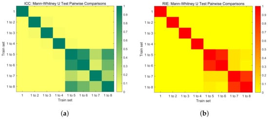 Mann–Whitney U test pairwise comparisons. (a) ICC: Mann–Whitney U test. (b) RIE: Mann–Whitney U test.