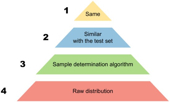 To address optimal sample combination with a fixed sample size, we propose a pyramid for sample determination, as shown in Figure 7. The order of the pyramid, from top to bottom, generally has four levels. The fourth level of the pyramid refers to the coarse distribution, which refers to the distribution of samples with simple determination or without determination. The third level of the pyramid is to select the samples to be generated in advance through the sample determination method without knowing the distribution of the test set. The second level representation of the pyramid involves knowing the partial distribution of the test set in advance and adjusting the partial distribution of the train set to achieve a certain degree of consistency. The first level of the pyramid represents the most ideal state, where the estimated output of the network is precisely the same as the gray scale of the ground truth.