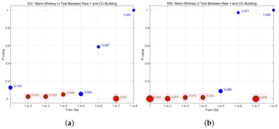 Mann–Whitney U test between RAW-1 and CC-building. (a) ICC: Mann–Whitney U test between RAW-1 and CC-building. (b) RIE: Mann–Whitney U test between RAW-1 and CC-building.