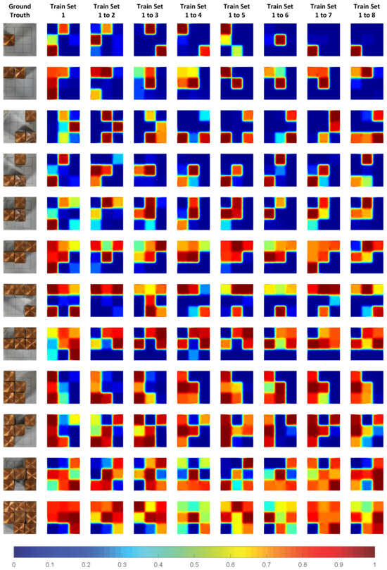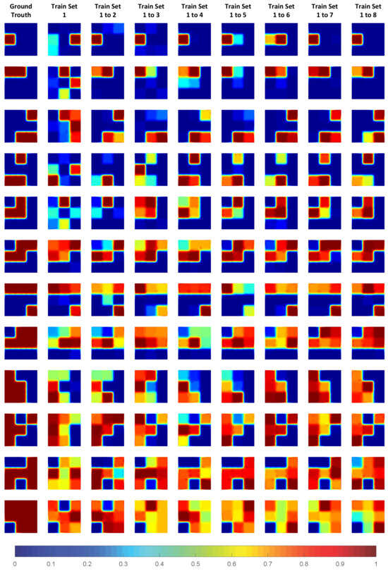 The specific image reconstruction results of the test set are shown in Figure 10. In Figure 10, the far left is the ground truth, and columns 2 to 9 are train set = 1, train set = 1 to 2, ..., train set = 1 to 8. Looking at each line from left to right, we can clearly see the improvement of the reconstructed image by gradually increasing the size of the training set. This process has not been presented in other studies. When the train set = 1 or 1 to 2, the reconstructed image can only basically describe the part of the location of the object, with significant artifacts and errors. However, as the amount of training set data gradually increases, the missing part of the object is gradually filled, and the false artifacts are gradually corrected. When the train set = 1 to 4, it is sufficient to complete a pretty good image reconstruction result. Particularly, when the train set = 1 to 5, 1 to 6, and 1 to 7, the difference in the accuracy of the reconstructed image is indeed not significant. From this perspective, the guarantee of the number of samples is a necessary condition for DL-EMT.