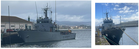 The target ship, shown in Figure 1, is a military patrol. This patrol vessel, named Tabarca, belongs to the Ferrol Maritime Action Force Units Command. Propulsion is provided by a single “BAZÁN MTU” model engine (MTU, Friedrichshafen, Germany) generating 4500 horsepower, enabling a maximum speed of 15 knots. Additionally, it is equipped with two auxiliary diesel engines of CHRYSLER-BARREIROS type BS-36ME (Chrysler, Detroit, MI, USA) that operate at 1500 rpm with supercharging capabilities. Construction features include a hull crafted from 7 mm A-grade steel and internally insulated with a 5 cm layer of thermal insulation (MW40 mineral wool). The vessel is fully welded, measuring 44.5 m in length and 6.6 m in beam width. Given its construction date, enhancements could be necessary to improve its thermal efficiency.