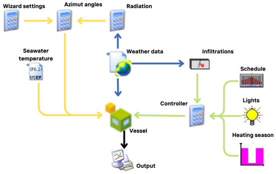 The model developed within the TRNSYS simulation framework (Figure 3) was constructed based on empirical data regarding vessel occupancy. All components utilized in the simulation were sourced from TRNSYS libraries. Each component within TRNSYS denotes a specific facet of the system under examination. To replicate the thermal dynamics of the vessel, TRNSYS Type 56 was utilized, defining the vessel as a singular temperature zone for procedural simplicity. Sensible heating and cooling demands were computed under ideal conditions, assuming perpetual availability of thermal reserves within the vessel. Given the vessel’s year-round operation, climate control systems must cater to space heating, ventilation, and summer cooling requirements. Monitoring activities spanned six months, during which setpoint temperatures were established (Figure 4). This involved the use of 12 iButton DS1923 sensors, offering a temperature accuracy of ±0.5 °C within the range of −10 °C to +65 °C. The ship does not have forced ventilation systems for air exchange.