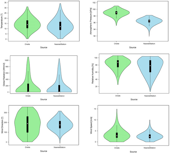 The statistical distribution of the meteorological variables for the two sources is shown using a violin plot (Figure 7). A box plot and a symmetric kernel density plot are combined to create the violin plot. This allows for the comparison of distributions by providing precise data on the distribution’s spread, outliers, asymmetry, and central values [26,27].