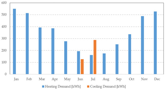 Monthly heating and cooling demands in kWh (hourly accounts) based on onsite weather data.