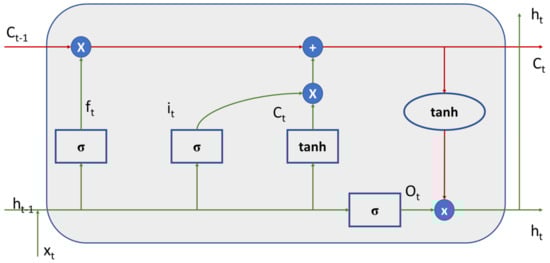 The idea behind creating an RNN model is that it can learn and extract intrinsic relationships from the provided dataset, being able to generalize the normal behavior of the bridge’s accelerations or movements and use that knowledge to predict accelerations out of the normal range. Artificial neural networks predict results from their input layer. In this layer, all the characteristics of the model are introduced, and a prediction is obtained as the output. However, these architectures do not take this into account when predicting the output of the previous prediction. With RNNs, the prediction at time T considers the prediction at time T. This aspect is fundamental in dynamic systems, where the displacements, accelerations, and speeds are related to each other with differential calculation, and therefore each moment of time is restricted by the previous one. In addition, it is possible to use the minimum number of transducers, as it is a single, self-sufficient sensor. Decoupling the prediction between accelerometers allows a better analysis of outliers on the occasion of technical problems. Conventional RNNs present two problems: the vanishing gradient and the exploding gradient. This is produced by the fact that the backpropagation algorithm over time generates a chain of multiplications of values between 0 and 1, which means that the network stops learning. On the other hand, the “forgetting” of the predictions generated with large temporal spaces occurs. This condition leads to the proposition of a long short-term memory (LSTM) architecture, which is represented in Figure 2.