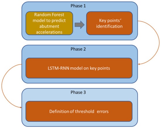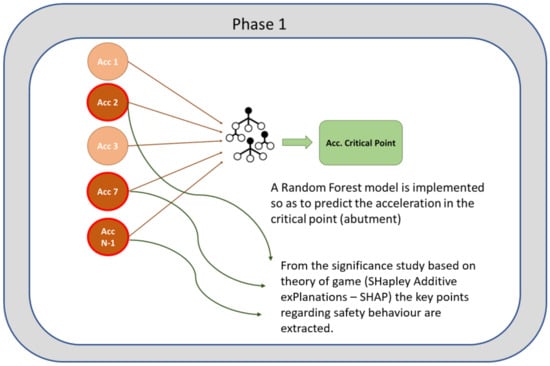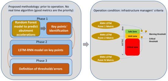 - Phase 1: A Random Forest algorithm predicts the response at the abutments (critical points) when a train is passing through. A significance study extracts the key points to be monitored with the aim of characterizing the structure’s health.
