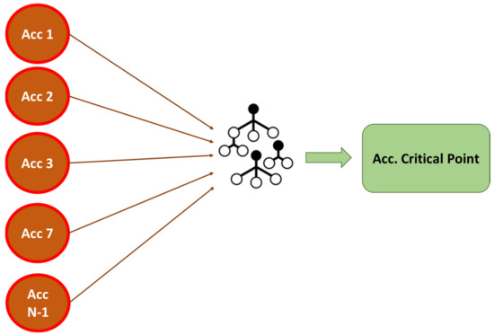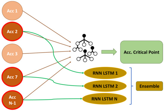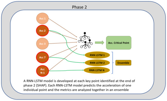 In phase 2, represented in Figure 5, the points that characterize the structure from a safety point of view are identified. The accelerometers identified in the previous section can predict the response at a critical point in the structure. However, some depend on others, and reducing the number of accelerometers involved in the prediction decreases precision. In this section, an LSTM RNN is created for each independently identified accelerometer, as illustrated below.
