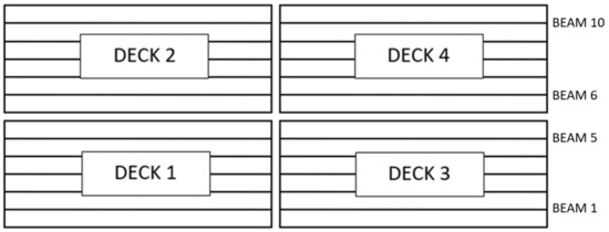 The bridge consists of a single central support and two lateral supports (abutments). The deck is divided into four independent sub-decks (one for each direction of traffic and span). Decks 1 and 3 correspond to one track, and the other two to the other track. This is represented in Figure 2. The study focused on one of the spans, with deck 1 being instrumented on the first day and deck 2 on the second day. The response of the bridge to the passage of trains in both directions of traffic was observed. In Figure 7, the different parts of the bridge are described.