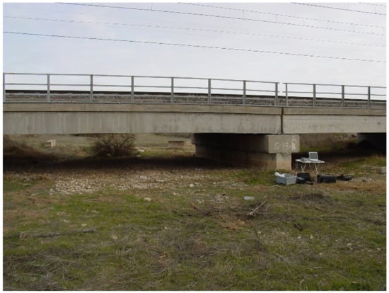 For a good characterization of the accelerations of the bridge with different trains crossing over it, a set of transducers was installed on the bridge for recording. Two types of sensors were used: accelerometers and laser distance sensors. The accelerometers were placed on the central beams of each deck, on the deck, on the abutments, and on one of the sleepers of the track under study. The sensors were fixed with adhesive material and in a vertical orientation. The laser sensors were placed at the mid-span point of each of the central beams. A representation of the transducer’s location could be found in Figure 3, where the acceleration and laser sensors are located under the bridge except for number 10, which is located in one railway sleeper. Sensor 2 was placed next to S13 (redundant information), so only S2 data are considered for the prediction. S6 was placed on beam 1, but, as the reliability of the measurements was low, the data were removed from the prediction model. Sensors are represented in Figure 8.