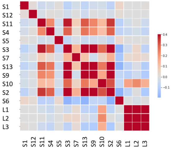 A heat map for the data correlation is represented in Figure 10. One important conclusion is that the laser sensors and acceleration sensors are not highly correlated, so they apparently represent two different measurement procedures and do not give additional valuable information.