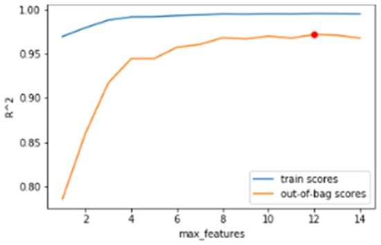 The hyperparameters of the model are adjusted based on the evaluation of the out-of-bag (OOB) error. In bagging methods such as Random Forest, part of the observations of the dataset is not used to train the algorithm. These observations that are left out of the development are subsequently evaluated by obtaining the OOB error. In this work, the OOB error is evaluated using the R2 metric for different numbers of features and trees.