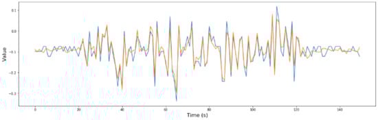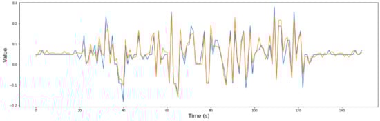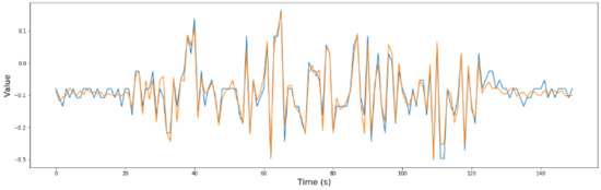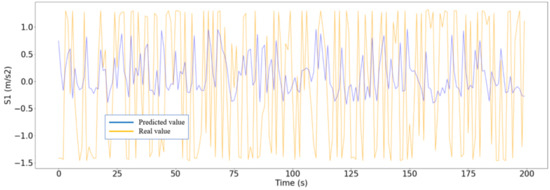The RNN developed data from the three trips in which the rain and the river flow influenced the bridge’s dynamic behavior, which were tested to verify if the model is able to obtain greater errors (degraded dynamic behavior detection) or not. After introducing these three cases, the errors obtained by the model were extremely high, so a degraded behavior of the bridge could be detected. In Figure 19, one of these situations is shown.