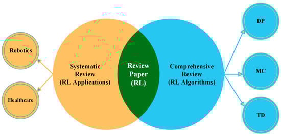 This review paper is structured into two distinct sections, as illustrated in Figure 2. The first part is a comprehensive review, which is a traditional literature review with the objective of offering a broad overview of the existing literature on a specific topic or subject [16]. This type of review, also known as a literature review or narrative review, can encompass various sources, including peer-reviewed original research, systematic reviews, meta-analyses, books, PhD dissertations, and non-peer-reviewed articles [17]. Comprehensive literature reviews (CLRs) have several advantages. They are generally easier to conduct than systematic literature reviews (SLRs) as they rely on the authors’ intuition and experience, allowing for some subjectivity. Additionally, CLRs are shaped by the authors’ assumptions and biases, which they can openly acknowledge and discuss [18]. Consequently, the initial part of this review offers a highly comprehensive introduction to reinforcement learning and its components. Subsequently, this review delves into the specifics of RL algorithms, highlighting their differences based on various criteria.