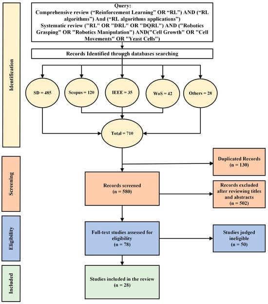 A comprehensive review was performed of the articles in the mentioned databases above. This article employed a Boolean query (conclude OR, AND) to establish a connection between the keywords for each part of the review. The search strategy for this comprehensive review includes this query (“Reinforcement Learning” OR “RL”) AND (“RL algorithms”) AND (“RL algorithms applications”). The search strategy for this systematic review incorporates the following query: (“RL” OR “DRL” OR “DQRL”) AND (“Robotics Grasping” OR “Robotics Manipulation”). The other query is identical, with the only difference being the replacement of (“Robotics” with “Cell Growth” OR “Cell Movements” OR “Yeast Cells”). The collected articles for this systematic review from databases were published from 2022 to December 2023.