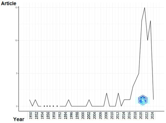 General trajectory: The general trajectory shows a consistent increase, as the annual publication count has risen from 1 in 1950 to 13 in 2023. Nevertheless, the data show significant variations, with some years seeing a decline in output.