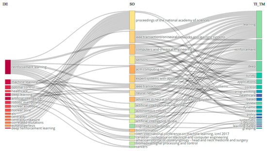 A three-field plot is a graphical representation used to exhibit data involving three variables. In this specific instance, the left field corresponds to keywords (DE), the center field corresponds to sources (SO), and the right field corresponds to Title (TI_TM). The plot is often used for the analysis of the interrelationships among the three parameters (refer to Figure 3). The analysis, identified in the middle sector (SO) of Figure 5, reveals that the Proceedings of the National Academy of Sciences, IEEE Transactions on Neural Networks and Learning Systems, and Computers and Chemical Engineering have received the highest number of citations from the sources (TI_TM) situated on the left side. The Proceedings of the National Academy of Sciences is the preeminent source that specifically addresses the subject of reinforcement learning. In addition, it is acknowledged in the field of DE that the most frequently used keywords across all categories are ‘reinforcement learning’, ‘machine learning’, ‘optimal control’, ‘healthcare’, ‘deep learning’, and ‘artificial intelligence’. These keywords are also commonly found in the journals listed in the middle field (SO).