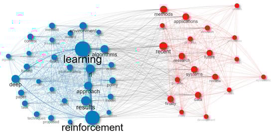 A co-occurrence network is another method used in bibliometric analysis. Previous research studies have identified common terms and analyzed them using a semantic network. This network offers valuable insights to professionals, policymakers, and scholars on the conceptual framework of a certain area. Figure 7 specifically presents data on a co-occurrence network that is constructed using the names of reinforcement learning methods and applications.