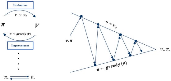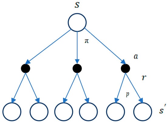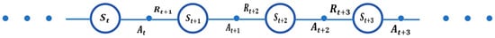 In essence, the MDP operates as follows: the agent takes an action from the current state , transitioning to another state , guided by the transition probability matrix . This iterative process persists until the agent reaches the final state with the highest possible reward, as depicted in Figure 8. These procedures are contingent on the value function of the state and the action, respectively. Through the value function, a policy function is derived to guide the agent in selecting the best action that maximizes the cumulative reward in the long run (Figure 9).