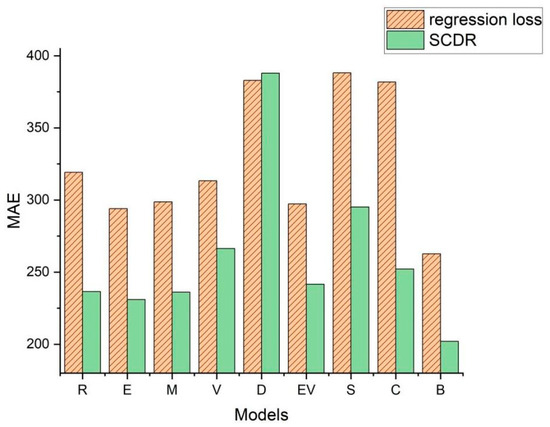 Displays the Mean Absolute Error (MAE) values for various models under two distinct loss functions. The corresponding letters and models are as follows: R—ResNet50; E—EfficientNetV2; M—MLP_Mixer; V—ViT; D—DaViT; EV—EfficientViT; S—SwinTransformers; C—ConvNeXtV2; and B—BioUMixer.