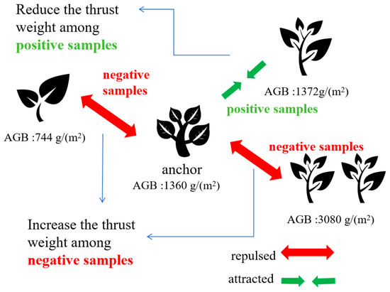 The fundamental innovation of SCDR resides in its unique methodology for computing contrastive loss, which holds pivotal significance in mitigating the regression challenges inherent in biomass prediction tasks utilizing deep learning methodologies. This pioneering framework encompasses two critical components: Firstly, the utilization of advanced techniques such as data augmentation and anchor data selection to generate two augmented samples for each data point, thereby enriching the training dataset and bolstering model robustness. Subsequently, SCDR integrates supervised contrastive learning with thrust weight computation, wherein weight calculation simultaneously considers both sample features and label similarities. This integration ensures that samples with analogous biomass values are strategically positioned closer in the feature space, facilitating precise prediction, while those with substantial biomass disparities are delineated by greater distances, thereby augmenting the model’s discriminative capabilities. Notably, in calculating thrust between negative sample pairs, the framework meticulously accounts for both label values and the similarity of feature pairs for negative samples, thus mitigating interference from inaccurately labeled pairs and further amplifying the accuracy and comprehensiveness of thrust calculations. This comprehensive approach, amalgamating both types of information, not only advances the accuracy of biomass prediction but also furnishes an extensive comprehension of the interplay between image features and biomass labels, as exemplified in the schematic depiction in Figure 2, illustrating thrust computation between sample pairs.