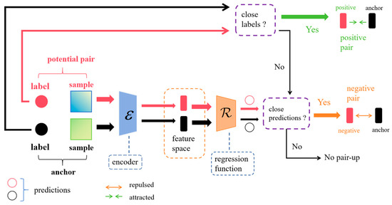 Consider two samples in the augmented sample set, and , which are passed through the feature encoder to produce two feature vectors and , i.e., and , respectively. After that, the regression function is used to obtain the predicted values and , respectively. The predicted and actual labeled values are used to determine whether the examples should be positive sample pairs, negative sample pairs, or unpaired. SCDR determines the similarity between labeled or predicted values in the augmented samples by defining a similarity threshold at . Given a similarity function, , two labeled values and (or predicted values and ) are considered similar if they have (or ). Two samples are considered positive if they have similar labeled values, and negative if they do not have similar labeled values but have similar predicted values. Outside of these two cases they are considered unpaired. The detailed process of pairwise selection for SCDR is shown in Figure 3.