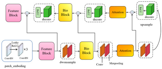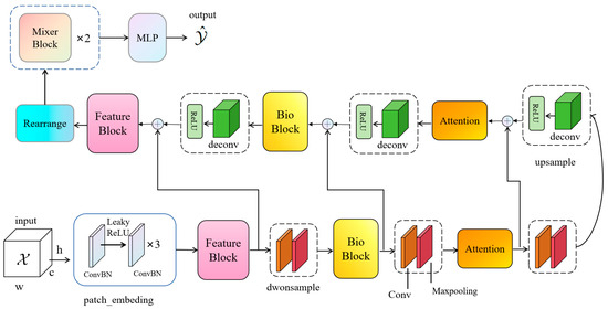 Overall architecture of BioUMixer. The input is introduced into the network via patch embedding. As it traverses each feature extraction module (FeatureBlock, BioBlock, Attention), shortcut branches are elongated to establish connections between the input and the subsequent module of identical nomenclature. Ultimately, the feature maps undergo processing through a MixerBlock and MLP to culminate in the ultimate output.