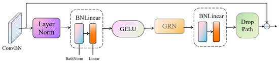 The FeatureBlock, integrating ConvNeXt and Transformer structures, is employed to enhance the model’s perceptual range in scenarios characterized by dense vegetation and complex background images. The introduction of BatchNorm serves to stabilize the feature distribution, thereby augmenting the model’s robustness. The utilization of Global Response Normalization (GRN) systematically addresses the challenge of feature folding, ensuring the comprehensive capture of global information within the images [43]. Concurrently, the integration of DropPath as a regularization technique effectively mitigates overfitting, consequently contributing to the enhanced accuracy of biomass prediction. The architecture of FeatureBlock is illustrated in Figure 5.