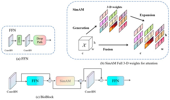 Overall structure of BioBlock: (a) FFN module structure; (b) SimAM, a full three-dimensional weighted attention. In each subfigure, consistent colors indicate the application of a single scalar to each channel, spatial position, or feature point; (c) BioBlock structure.