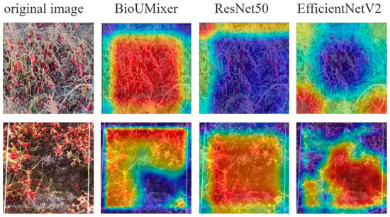 From the visualizations, it is evident that the attention regions of the BioUMixer model closely align with densely populated regions of pepper fruits and stems in the original images, particularly noticeable in the second row of images. In the images of the second row, the lower-right corner corresponds noticeably to bare soil, while the peppers on the left and top sides form a right angle, aligning closely with the red regions in the heatmap. Conversely, the bare soil area in the lower right corner is represented by blue in the heatmap. This observation indicates that the BioUMixer model actively learns regions highly correlated with pepper biomass during its learning process. In contrast, attention regions in the heatmap of the other two models exhibit misalignment or excessive focus on areas unrelated to biomass contribution.