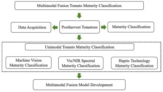 Assessing fruit maturity is a complex process encompassing color, internal quality, and firmness [28]. Current maturity detection often relies on a single non-destructive testing (NDT) method, yielding partial information that may lead to inaccurate maturity assessments. While imaging techniques can evaluate appearance, they often cannot adequately assess internal quality and firmness. Similarly, Vis/NIR spectroscopy offers insights into internal quality via spectral data, and tactile sensing technology captures fruit firmness through signal strength. However, each method’s perspective does not fully address the multidimensional nature of fruit maturity. Multimodal fusion technology, which integrates data from multiple NDT methods, has emerged as a solution to overcoming these limitations, enhancing accuracy and compensating for the limitations of individual methods. Currently, multimodal fusion techniques have been used in a variety of fields, such as medical diagnosis [29], emotion recognition [30], education [31], industrial fault diagnosis [32], and autonomous driving [33]. A number of reports have applied multimodal fusion technology to agriculture-related research [34,35,36,37,38]. The application of multimodal fusion technology in agricultural technology, especially in the assessment of fruit and vegetable maturity, not only improves the accuracy and efficiency of the assessment but also provides a new perspective for agricultural production and quality assessment supply chain management.