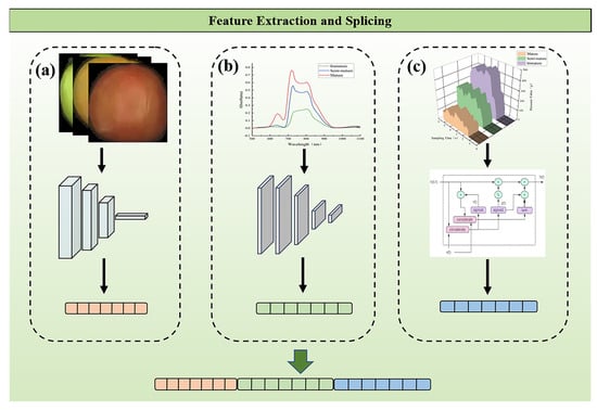 Diagram of feature extraction and fusion. (a) Image feature extraction; (b) Vis/NIR spectral feature extraction; (c) haptic feature extraction.