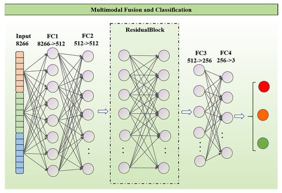 In this study, a fully connected deep neural network model was proposed for processing multimodal data, as shown in Figure 4. The model adopted a multi-layer fully connected architecture that incorporated a residual learning mechanism to enhance the model’s learning ability and generalization performance when processing complex datasets. The model had a total of four fully connected layers, each of which contained 8266, 512, 512, and 256 neurons, respectively, and each fully connected layer was immediately followed by a batch normalization layer, a ReLU activation function, and a Dropout layer. The first two fully connected layers were used for feature extraction, and two fully connected layers were used for classification. In addition, a residual block was introduced between the second and third fully connected layers which contained two fully-connected layers, and the two connected layers were followed by the batch normalization and Dropout layers after each layer. The batch normalization layer was used to normalize the output of the layer to improve training stability and efficiency. The ReLU activation function was applied to introduce nonlinearities and enhance the expressive power of the model. The Dropout layer prevented overfitting by setting a reasonable scale size. The whole network realized the efficient processing of multimodal data through this layered structure and residual learning strategy.