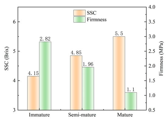 The internal nutrients of tomatoes change during ripening in addition to changes in the exocarp and internal color. This study also investigated changes in the soluble solids content and hardness during the tomato ripening process, which can further be used for the establishment of SSC and hardness prediction models in future research. As shown in Figure 5, the soluble solids content of the tomatoes showed an ascending trend as they ripened, while the firmness of the tomatoes decreased gradually. The mean SSC values of tomatoes in different ripening periods were 4.15, 4.85, and 5.5 Brix, and the mean values of firmness were 2.82, 1.96, and 1.1 MPa. These findings indicate a clear negative correlation between the soluble solids content and fruit firmness during the tomato maturation process. However, these traditional methods of maturity assessment are destructive, posing challenges for rapid and non-destructive testing requirements in fruit and vegetable quality monitoring and inspection.