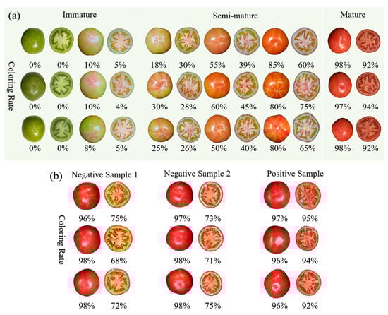 As illustrated in Figure 6a, significant color changes were observed in the tomatoes during ripening. The exocarp and mesocarp evolved from greenish-white to pink and finally to bright red, while the endocarp transitioned from green to white to red. Similarly, the funiculus color shifted from green to light yellow, culminating in red at full maturity. These color changes effectively illustrate the progression from immature to semi-mature and ultimately mature stages, highlighting the dynamic nature of the ripening process. Images, as the most commonly used means of determining tomato ripeness, are capable of capturing color changes in exterior appearance, and, as shown in Figure 6a, image processing techniques are able to calculate the percentage of red color on the surface of a tomato and classify it correctly, thus accurately determining tomato ripeness by appearance. Due to a variety of factors, tomato maturity was not uniform, and there were cases in which the exterior was mature but the interior was not, making it impossible to identify the interior color and texture from the exterior image. As shown in Figure 6b, we analyzed three categories of tomatoes with a red appearance but different internal maturity conditions and determined by their appearance that the tomatoes had all reached maturity. Negative samples 1 and 2 were judged to be mature according to their appearance; the outer skin color ratio reached more than 95% but the interior was not mature, and the color ratio was about 70%. The color ratio of the positive sample reached more than 95%, showing the best mature state. Immature tomatoes contain lycopene, which can be harmful to the human body after consumption [52], so it is necessary to combine a variety of nondestructive testing techniques to determine the maturity of tomatoes comprehensively.