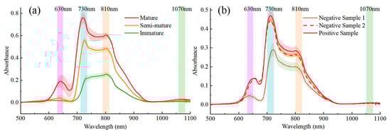 Spectral information of tomatoes at different maturity stages; (a) spectral information of tomatoes at three ripening stages: immature, semi-mature, and mature; (b) spectral information of cross-sectioned unevenly mature tomatoes.