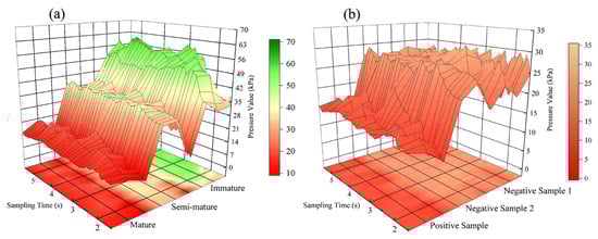 Pronounced changes in tomato firmness throughout ripening were depicted using 3D color-mapped surfaces of tactile pressure signals (Figure 8a). Mature tomatoes exhibited pressure values ranging from 13 to 26 kPa, semi-mature tomatoes exhibited pressure values ranging from 26 to 46 kPa, and immature tomatoes exhibited pressure values ranging from 52 to 65 kPa. These variations were attributed to the enzymatic breakdown of pectin, leading to tissue softening [55]. Consequently, the marked differences in firmness at each ripening stage suggest a potential for non-destructive maturity assessments through haptic analysis, offering a straightforward method for evaluating tomato quality. In a case of heterogeneous internal and external ripening, the interior of negative sample 2 was off-white and the texture of the tomato was hard, so we utilized the characteristic of negative sample 2’s hard texture to differentiate negative sample 2 from the positive sample by the haptic technique. As shown in Figure 8b, negative samples 1 and 2 were less mature and had a hard texture, but the mature positive sample had a softer texture. From the data, the pressure values of negative samples 1 and 2 reached approximately 29 kPa, and the pressure value of the positive sample reached about 13 kPa. Therefore, negative sample 2 and the positive sample could be distinguished through the difference in pressure values, thereby making up for the inability of the spectrum to distinguish samples from the two groups.