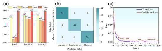 To examine the multimodal fusion classification network from multiple perspectives and demonstrate the classification results more intuitively, we plotted a confusion matrix of the FCNN model’s classification results in Figure 9b. Only one mature sample is misclassified as a semi-mature sample, which may have been caused by the closer proximity of the test sample to the semi-mature sample, but overall, the overall classification accuracy is still high. In addition, the loss values (Loss) during the model training process used to comprehensively assess the overall ability of the model were examined, as shown in Figure 9c. The curves of the loss function values of the model on the training and test sets showed a fast decreasing trend and then gradually stabilized. After approximately 30 instances of training time, the loss values of the model’s training and test sets were stabilized at 0.03 and 0.09. The convergence of the model could be obtained through the Loss curve, which indicates that the model’s training effect is relatively good and the model was able to correctly capture the laws in the training data. By comprehensively analyzing the confusion matrix and loss curves, we were able to understand the classification performance, training process, and generalization ability of each model more comprehensively, thus providing a more solid basis for model selection and adjustment.