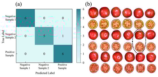 Beyond classifying tomatoes into immature, semi-mature, and mature categories based on apparent changes, the current study also extended to classifying tomatoes with uniform external redness but varied internal ripeness levels. We employed VGG16, 1D-CNN, and LSTM models to integrate the image, spectral, and haptic data into the fusion model for this purpose. A validation set of eighteen samples yielded an accuracy rate of 94.4%. The confusion matrix displayed in Figure 10a reveals a single instance in which a negative sample 2 sample was incorrectly classified as a positive sample. The misclassified sample is shown in Figure 10b. We measured a firmness value of 1.3 MPa for this sample. This could be due to the low firmness value of this sample, which resulted in the misclassification of this sample due to the close proximity of the three features extracted from the image, spectral, and haptic data to the positive sample.