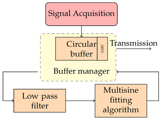 To develop detection and segmentation algorithms suitable for low-cost hardware of the LDN, the typical methodologies proposed in the literature cannot be used. The solutions based on wavelet transform [48,49], STFT, and the auto-regressive model [50] require high computational power, and, as a consequence, expensive hardware. In the design of the detection method algorithm, the PQ events taken into consideration are the most typical ones defined by international standards and in the literature [14,22,23,24,25,26,34,35,36,37,38,39,51]. In particular, the PQ events considered are as follows: interruption, sage, swell, harmonic, transient, flicker, notch, and spike. The proposed detection and segmentation of PQ events method is schematized in Figure 4. Each acquired sample is stored in a circular buffer implementing a FIFO policy. The logic of the circular buffer is to keep the new samples from overwriting the oldest ones. The Buffer Manager (BM) takes the SAW, a subset of the circular buffer, to be analyzed to detect an event. The samples in the SAW are filtered with a low-pass digital filter with a cut-off frequency of 200 Hz. The three-parameter multi-sine fitting algorithm is executed on the filtered samples. Filtering is necessary to reduce the influence of noise and make the proposed method suitable for noisy environments. The filtered samples are processed by a multi-sine fitting algorithm. This is a non-iterative procedure that estimates the parameters of the fundamental and harmonic components by minimizing the RMS error between the samples received in the input and the reconstructed ones [52]. In this way, the distortion of the nominal sinusoidal caused by a PQ event can be detected. If a PQ event is detected, the BM performs the segmentation with the samples stored in the circular buffer to the CCU for the classification of the event. Otherwise, the BM selects the next subset of the memory to be analyzed, starting from a pre-established shift in the circular buffer memory location. The dimension of the SAW is chosen according to the number of samples necessary for subsequent classification.