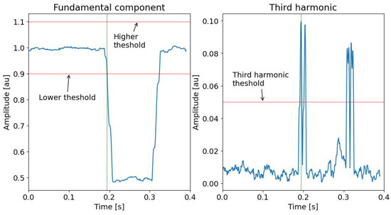 As an example, Figure 5 shows the trend of a signal affected by Sag. The figure highlights the subset of the acquired samples in the SAW that are analyzed with the multi-sine fitting algorithm to detect the presence of PQ events. Figure 6 shows the amplitude of the fundamental component and of the third harmonic versus time, i.e., versus the sliding of the SAW. In the example, the SAW has a duration of 0.010 s, and it slides a number of samples equal to 0.002 s. This figure highlights that it is possible to define threshold values to detect the presence of the event. Figure 7 shows an example of the trend of the first and third components for different typologies of PQ events with superimposed white Gaussian noise giving an SNR of 20 dB. From an exhaustive numerical investigation, it is highlighted that to detect the presence of any event, it is sufficient to verify that the fundamental-component normalized amplitude is out of the range of and , and the estimated third-harmonic normalized amplitude is over .